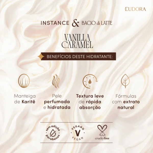 Eudora Instance Vanilla Caramel combina a amada Baunilha de Eudora Instance com caramelo e o delicioso acorde Bacio di Latte em uma fragrância oriental envolvente e marcante.